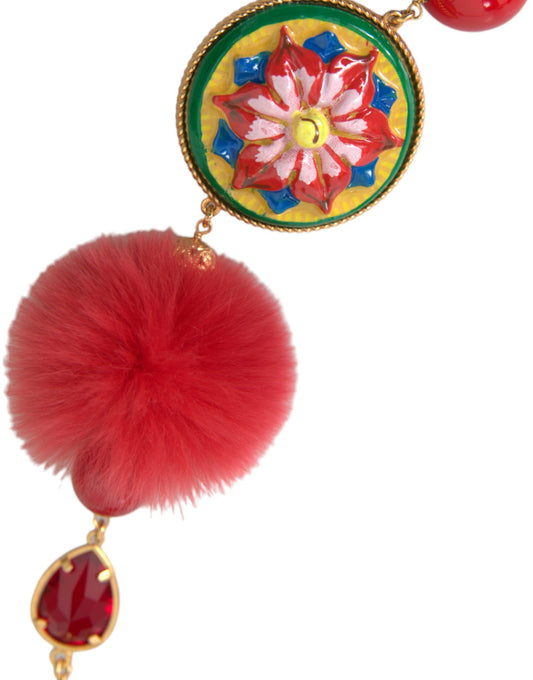 Dolce & Gabbana Gold Brass Red Fur Crystal Carretto Chain Necklace